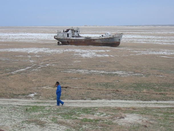 Les soviétiques avaient pour but de détourner les fleuves Amou-Daria et Syr-Daria dans les années 1960. Et par la main de l’homme, ce gigantesque lac s’est complètement asséché, voyant sa surface réduite de moitié en 2000. 28 espèces de poissons ont disparu suite à cette catastrophe environnementale. On peut d’ailleurs voir qu’il ne reste rien si ce n’est des épaves de bateaux échoués dans ce qui n’est plus qu’un désert.