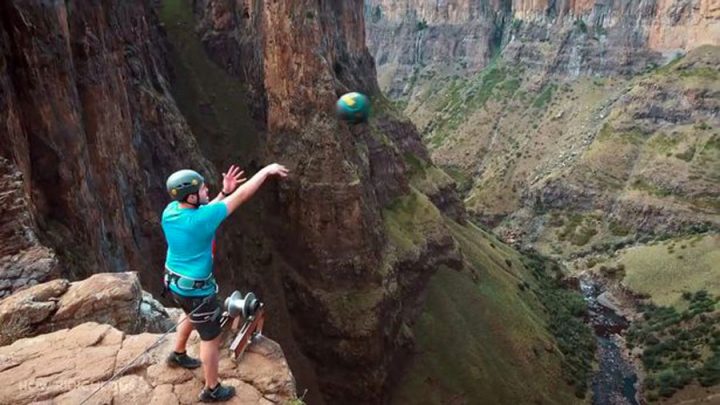 Derek Herron fait partie de l’équipe australienne How Ridiculous qui poste des vidéos sur YouTube. Il a réussi un exploit incroyable qui a été officiellement homologué par le Livre Guinness des records. Derek s’est rendu à Maletsunyane, une falaise impressionnante, au Lesotho. « Allez mec, aujourd’hui est le grand jour », l’ont encouragé ses amis. Il a lancé un ballon de basket du haut de la falaise, et au pied du panier, ses amis ont pu être témoins que… le ballon est bien retombé dedans.