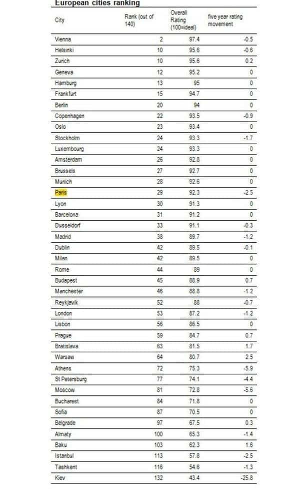 Le cabinet britannique The Economist Intelligence Unit vient de publier son classement annuel des 140 villes les plus agréables au monde : si Paris occupait la 20ème place, elle descend cette année à la 29ème place… La raison ? Les attentats du début de l’année contre le magazine satirique Charlie Hebdo.