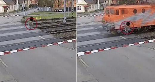 En passant sur ce passage à niveau, cet homme a frôlé la mort à quelques millimètres près…. Totalement dingue ! (vidéo)