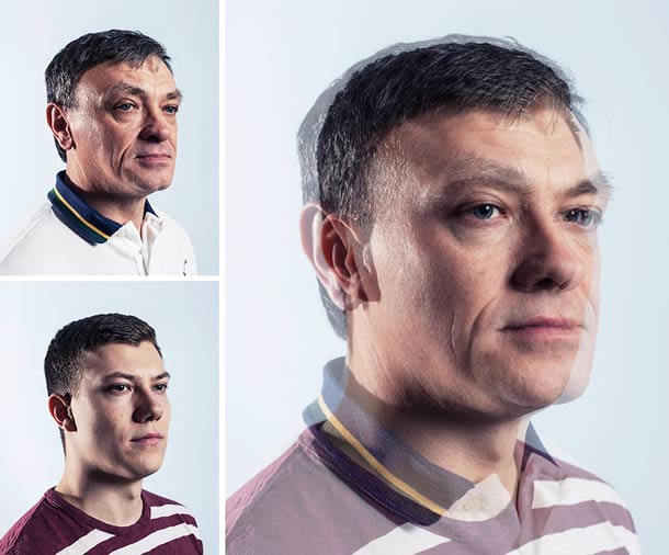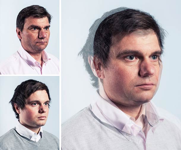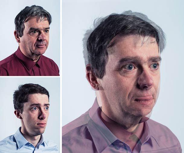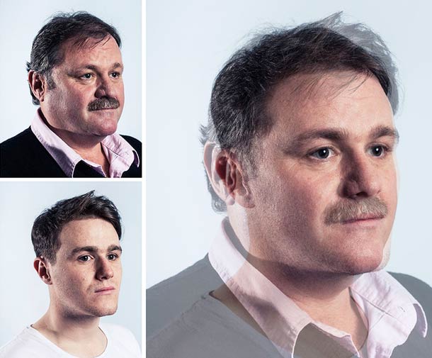 Pour cette démonstration éloquente, il a superposé les portraits de pères et de fils et a fait ressortir les similitudes par effet de transparence.