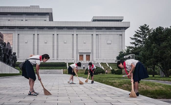 Il y a une règle d’or en Corée du Nord : ne jamais donner l’impression de ne rien faire. Ces filles en uniformes travaillent pour le gouvernement et nettoient un trottoir déjà immaculé en attendant qu’on leur donne quelque chose à faire.