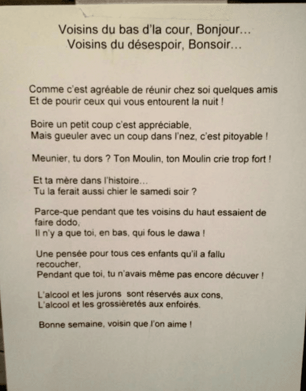 TDN > Insolite Les 50 mots les plus fous et drôles laissés par vos chers voisins ! Publié par Marie le 24 Jan 2024 à 16:55 Suivez nous sur Google News Partagez cet article Voisins poète tu es chouette Veuillez laisser ce champ videRejoignez nos 875 726 abonnés en recevant notre newsletter gratuite N'oubliez pas de cliquer sur l'email de validation pour confirmer votre adresse email. Si vous ne l'avez pas recu vérifiez dans vos spams. Dernière étape pour confirmer votre inscription : il faut cliquer l'email de confirmation. Vérifiez dans vos spams si vous ne l'avez pas reçu ! A bientôt ! Page précédente Page suivante Laissez un commentaire Votre adresse e-mail ne sera pas publiée. Les champs obligatoires sont indiqués avec * Votre commentaire * Votre pseudo * Votre adresse e-mail * Cliquez ici pour commenter