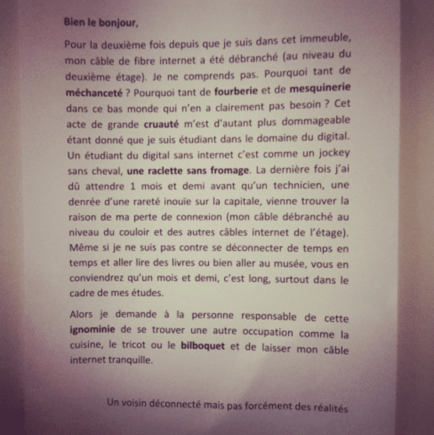 TDN > Insolite Les 50 mots les plus fous et drôles laissés par vos chers voisins ! Publié par Marie le 24 Jan 2024 à 16:55 Suivez nous sur Google News Partagez cet article OUPS ! Veuillez laisser ce champ videRejoignez nos 875 726 abonnés en recevant notre newsletter gratuite N'oubliez pas de cliquer sur l'email de validation pour confirmer votre adresse email. Si vous ne l'avez pas recu vérifiez dans vos spams. Dernière étape pour confirmer votre inscription : il faut cliquer l'email de confirmation. Vérifiez dans vos spams si vous ne l'avez pas reçu ! A bientôt ! Page précédente Page suivante Laissez un commentaire Votre adresse e-mail ne sera pas publiée. Les champs obligatoires sont indiqués avec * Votre commentaire * Votre pseudo * Votre adresse e-mail * Cliquez ici pour commenter