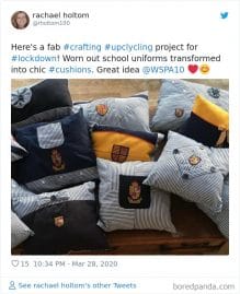 « Voilà un fabuleux projet d’artisanat. Des uniformes scolaires usés deviennent des chics coussins. Super idée »