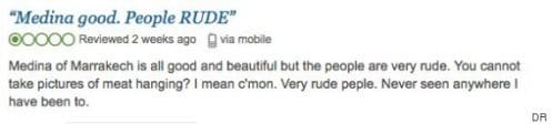 4- « La médina de Marrakech est très jolie mais les gens sont très malpolis. Impossible de prendre une photo d’un morceau de viande suspendu? Sérieusement? Je n’ai jamais vu ça ailleurs ». Par contre c’est inacceptable ! D’où on ne peut pas prendre la viande en photo ?!