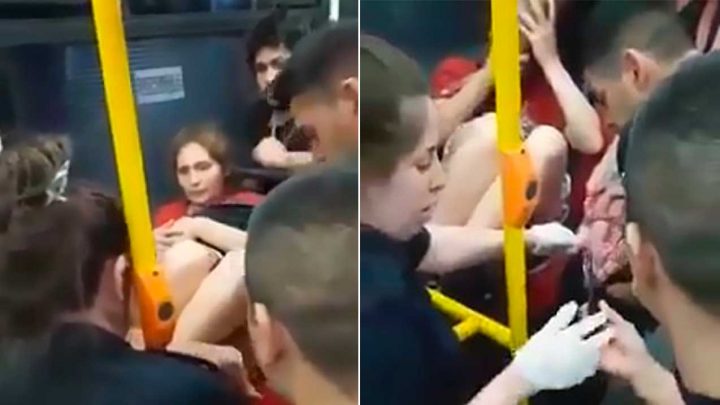 Trois policiers aident une femme à accoucher dans un bus
