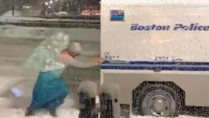 Des scènes bizarres on en a vues… Mais celle-là est la plus absurde qu’on peut imaginer. Comme vous pouvez le voir dans la vidéo, une « reine des neiges » pousse un fourgon de police… dans la neige. C’est bien « Elsa » qui montre ses muscles dans cette tempête de neige. Un avocat de 37 ans, déguisé en princesse, a connu son quart d’heure de gloire grâce à cette vidéo postée sur les réseaux sociaux.