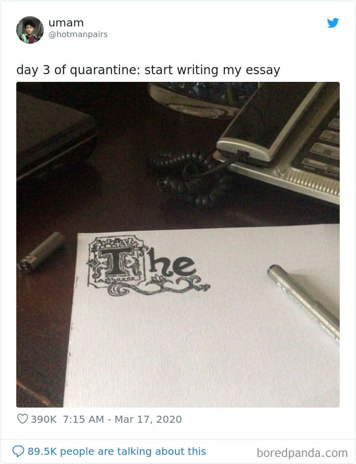 Traduction: Troisième jour de quarantaine: je commence à écrire mon essai.