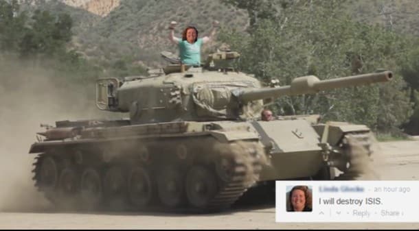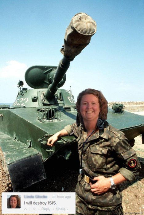 Traduit en français par « Je vais détruire l’État Islamique », ce commentaire, devenu viral, est accompagné de photomontages de Linda très imaginatif : Captain America, dans un char, au milieu des dunes, présidente ou encore en militaire, il en faut pour tous les goûts.