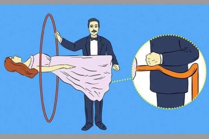 Elle est en fait allongée sur une table, élevée par une structure invisible pour le public. Le magicien n’a qu’à agiter son cerceau des deux côtés du poteau qui soutient la table sur laquelle elle repose.