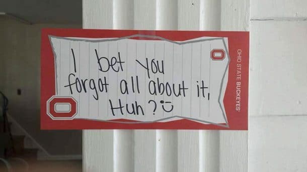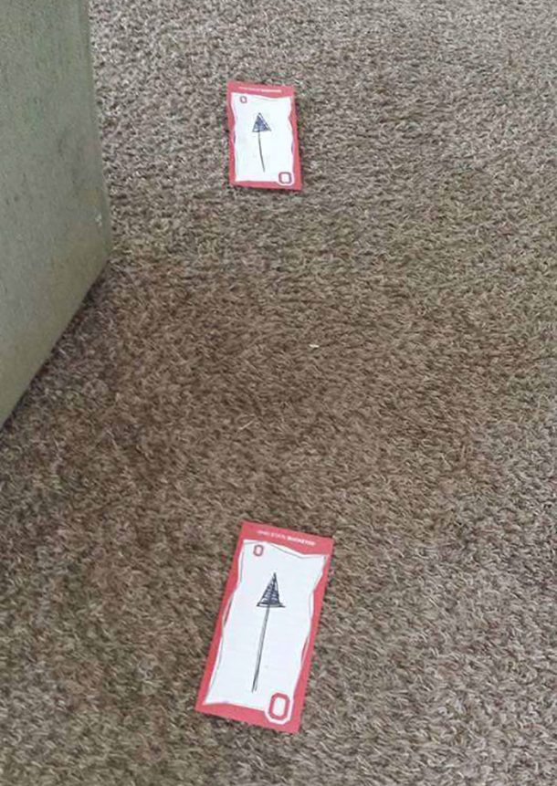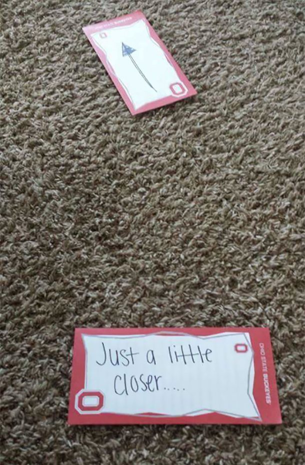 En effet, il lui a organisé tout un parcours à suivre à l’aide de petits mots déposés un peu partout dans la maison. Le premier commence d’ailleurs dès la porte d’entrée. Et s’en suit tout un chemin, avec des mots, des flèches, des indications…. Bref, le mec a pensé à tout et pendant une seconde j’ai trouvé ça super mignon, lol. Ce qui est horrible, c’est qu’on s’attend vraiment à un truc de fou. Une très très belle surprise. Le genre de surprise qui nous fait chialer. Le genre de surprise qu’on n’arriverait jamais à me faire 😉 Mais en fait non, regardez :
