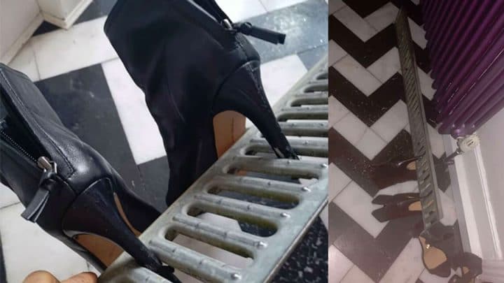 Toutes les filles le savent, les retours de soirée, dans le noir, dans le froid, un peu ivres, peuvent devenir un vrai calvaire quand on porte des talons. C’est d’autant plus vrai si on traverse un chemin avec du gravier ou une place avec des pavés, sans compter les innombrables pièges que l’on croise, notamment les grilles de caniveau. Une sorteuse complètement saoule s’est prise les deux pieds dans la grille d’une évacuation d’eau mais elle s’en est souvenue le lendemain, lorsqu’elle a retrouvé la grille chez elle ! Regardez la vidéo pour découvrir les images de sa surprenante découverte.