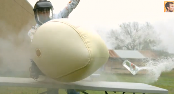 C’est impressionnant de voir à quelle vitesse il se déploie, car même au ralenti ça ne dure pas beaucoup de temps ! Ils font l’expérience avec un verre qui tombe près de l’airbag, et on peut voir que le verre est directement éjecté de l’autre côté en à peine 2 secondes.
