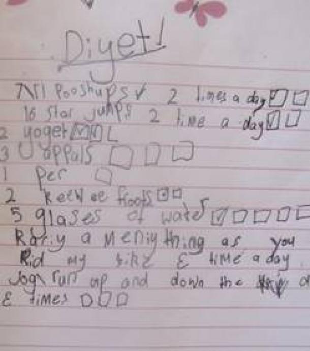 Amy Cheney a en effet découvert une incroyable liste au milieu des jouets de sa fille. C’est en fait tout un programme minceur que sa petite fille de 7 ans avait soigneusement dressé sur une feuille.