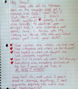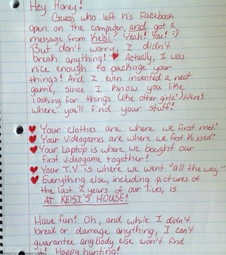 Après une rupture il est parfois difficile de récupérer ses affaires personnelles. Eh bien cette jeune Américaine a décidé de les rendre à son ex en lui écrivant une lettre. Gentille attention ? Détrompez-vous ! Dans cette lettre l’étudiante invite le jeune homme à récupérer ses affaires au cours d’une chasse au trésor. Pour cela la jeune fille a fait appel aux souvenirs de celui-ci.