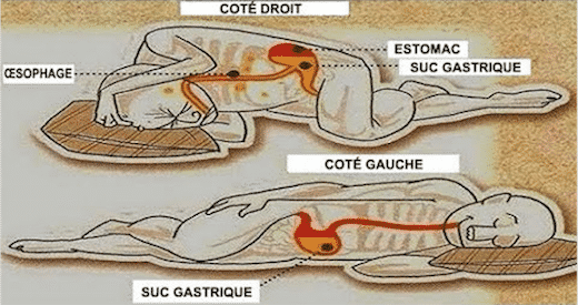 L’estomac et le pancréas se trouvent à gauche. Dormir de ce côté permet de canaliser les sucs gastriques et de favoriser la sécrétion des enzymes pancréatiques.