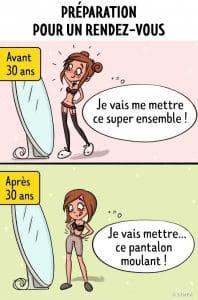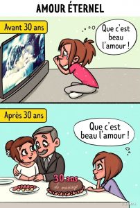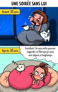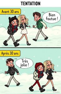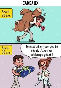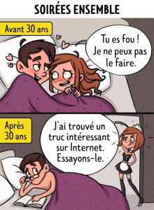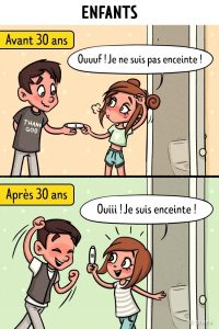 Changements de situation, premières véritables réalisation quant à l’âge, premiers enfants… La liste est longue, pas exhaustive et se ressent différemment pour chaque personne, mais il y a tout de même certains sujets qui restent étonnamment similaires chez la plupart des gens, qu’ils s’agisse d’hommes ou de femmes, de célibataires ou de couples. Dans les 12 mini bandes dessinées qui suivent, il s’agit pour le coup de couples, et des différences qu’ils peuvent rencontrer et ressentir une fois la fameuse barre des trente ans dépassée.
