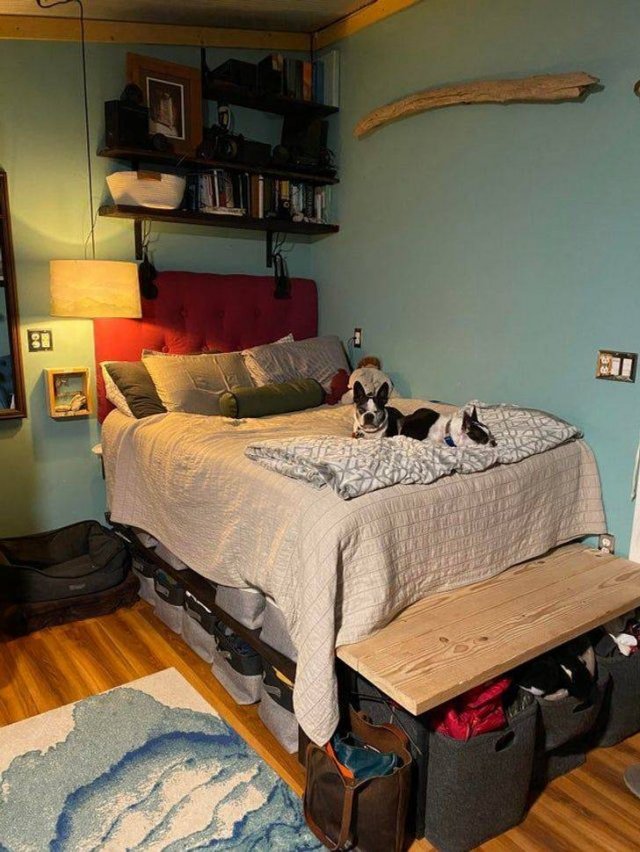 Un lit surélevé et des rangements à portée de pieds