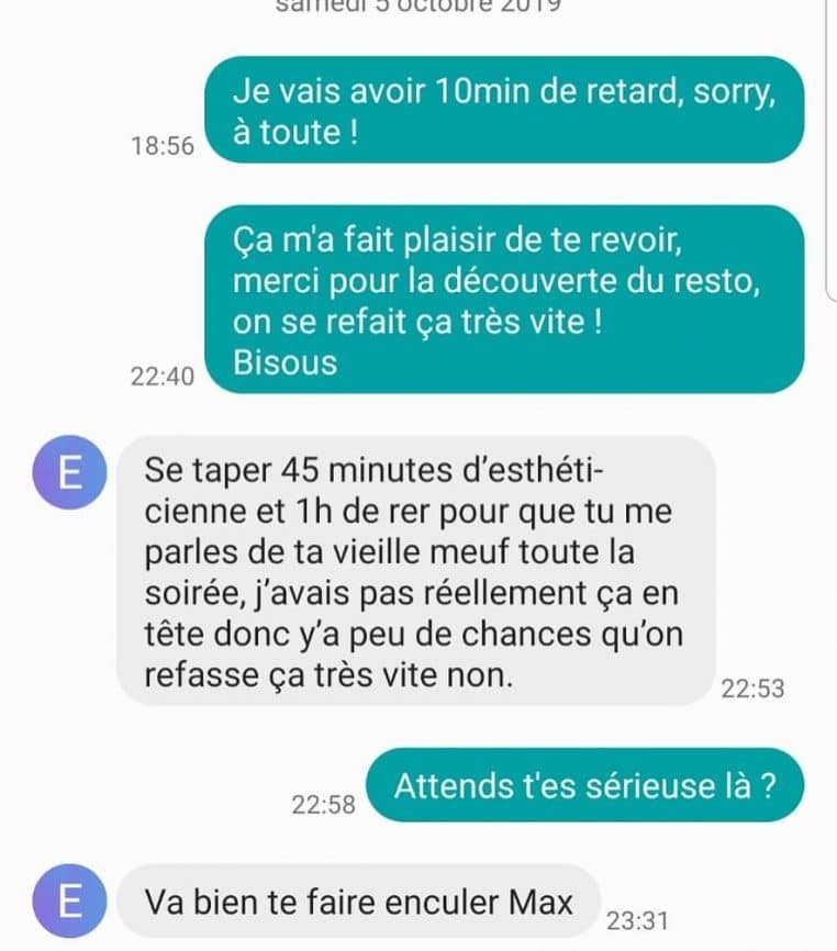 TDN > Lifestyle Ex relou : les 50 pires messages envoyés par nos exs ! Publié par Elsa Fanjul le 09 Avr 2024 à 14:04 Suivez nous sur Google News Partagez cet article Max qui déçoit Page précédente Page suivante