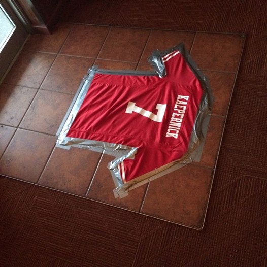 Voilà un geste qui n’a pas plu du tout chez nos amis américains. Et c’est le restaurant Krossroads, situé à Virginia Beach en Virginie qui en est l’auteur. C’est une photo postée sur Facebook par James Perry, un (ex)client du Krossroads, qui a déclenché les hostilités. En effet, on peut y voir le maillot d’un joueur de football américain fixé sur le sol. Le maillot en question appartient au quaterback Colin Kaepernick qui joue pour les 49er de San Francisco. Et son maillot était fixé au sol avec du ruban adhésif, devant la porte du resto. Il avait volontairement été placé ainsi dans le but de s’en servir comme paillasson.
