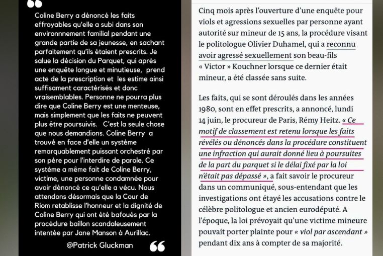 En effet, l’affaire Duhamel a également été classée sans suite récemment. Une information qui a d’ailleurs été relayée par Coline Berry-Rojtman, sur son compte Instagram, comme référence à son propre cas. « Ce motif de classement est retenu lorsque les faits révélés ou dénoncés dans la procédure constituent une infraction qui aurait donné lieu à poursuites de la part du parquet si le délai fixé par la loi n’était pas dépassé » , peut-on lire sur la capture d’écran de l’actrice montrant un passage du journal Le Monde au sujet de l’affaire Duhamel.