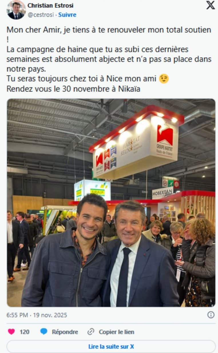 Cerise sur le gâteau, il peut compter sur le soutien indéfectible de certains élus. C’est notamment le cas du maire de Nice, Christian Estrosi. Afin de faire taire les oiseaux de mauvais augure, l’ancien pilote de F1 s’est affiché en compagnie du chanteur. La légende n’a laissé aucun de ses abonnés indifférent, et surtout pas l’entourage du concerné. « Mon cher Amir, je tiens à te renouveler mon total soutien ! La campagne de haine que tu as subi ces dernières semaines est absolument abjecte et n’a pas sa place dans notre pays. Tu seras toujours chez toi à Nice mon ami. Rendez-vous le 30 novembre à Nikaïa »