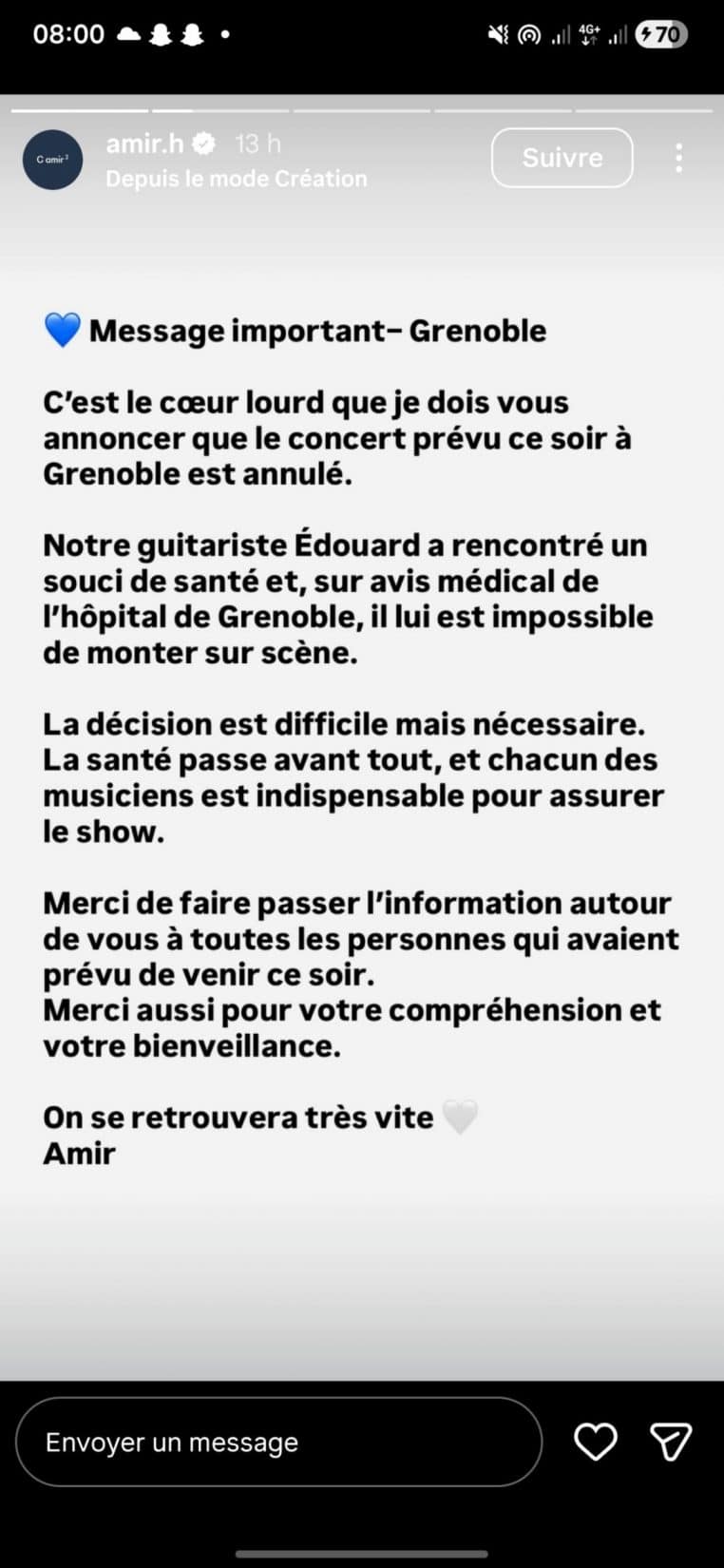 Alors qu’il était en pleine tournée, Amir a dû gérer une catastrophe. Et pour cause, l’un de ses musiciens n’était pas assez en forme pour assurer sur scène. Forcément, le forfait de son guitariste a eu des conséquences sur le moral de la troupe. Aussi, voulant jouer la carte de la transparence avec sa communauté, le chanteur a d’abord tiré la sonnette d’alarme sur Instagram