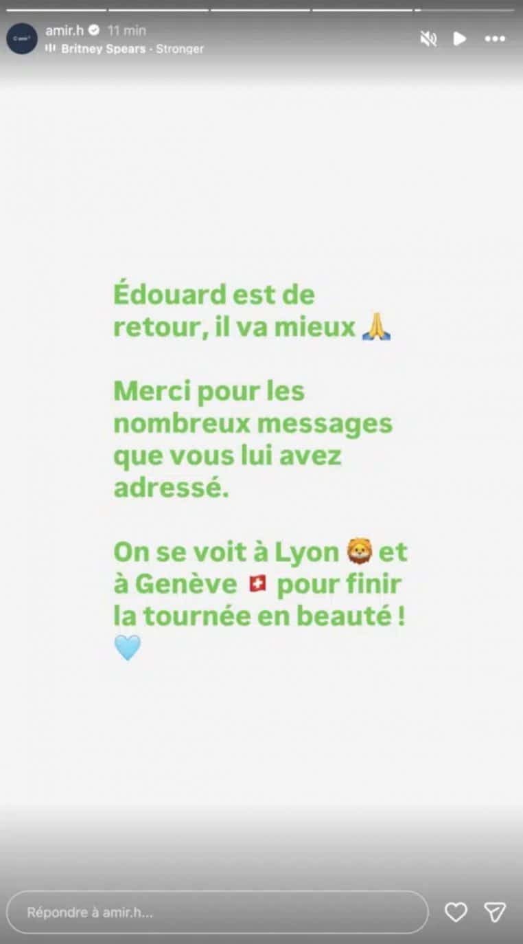 Quelques heures plus tard, Amir a pris la parole devant la salle de spectacle. Du reste, des arguments pour consoler son public, il en a à la pelle. D’abord, il a souligné que la « décision est difficile mais nécessaire. La santé passe avant tout, et chacun des musiciens est indispensable pour assurer le show.» Ensuite, il a fait des révélations sur l’état de santé de ce membre indispensable de son équipe. « Édouard ne se sent pas très bien. Il est actuellement aux urgences et […] les médecins lui interdisent formellement de faire ce concert car il y a un risque réel pour sa santé et ils ont besoin de s’occuper de lui en espérant le remettre sur pied pour que demain à Lyon il puisse être là » .