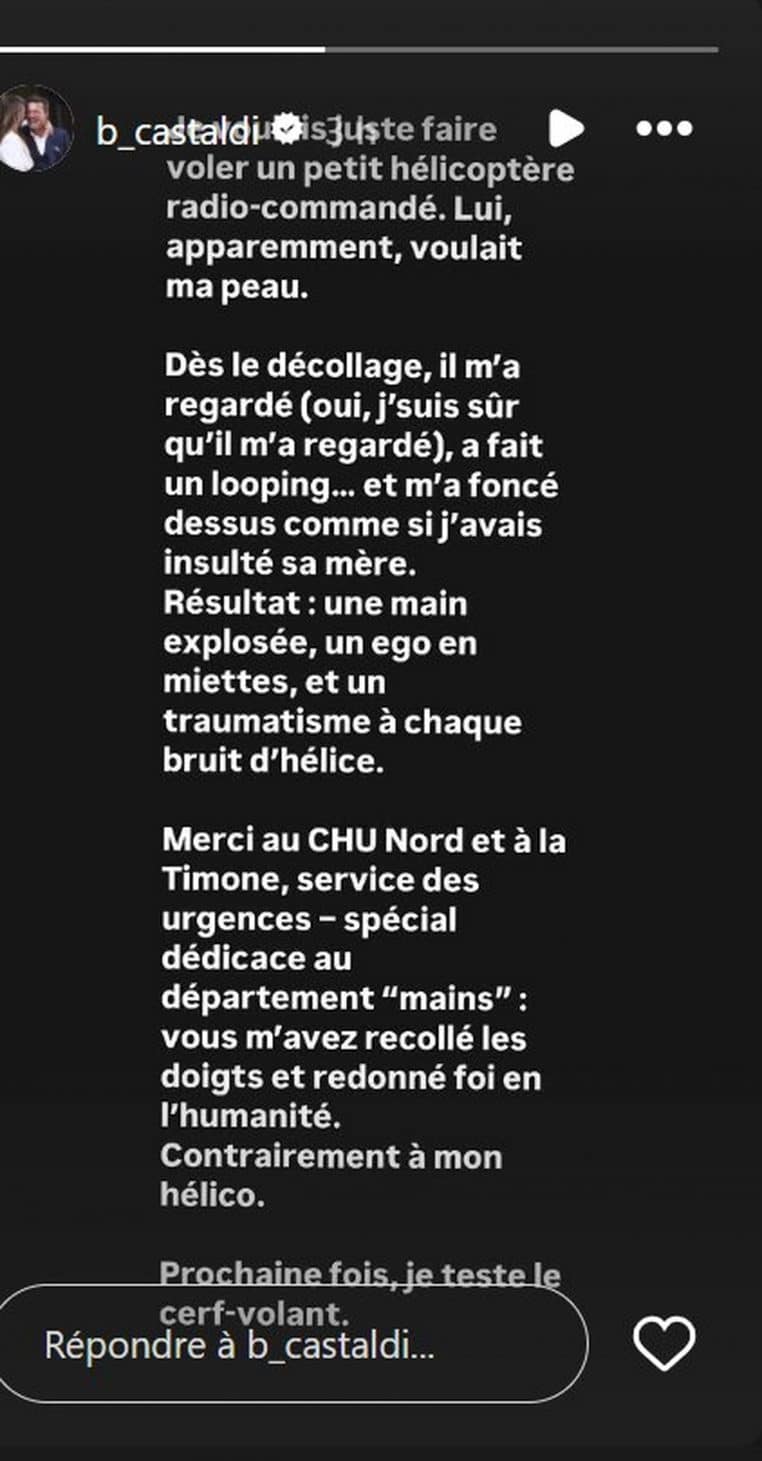 « Benjamin Castaldi hospitalisé en urgence à l’hôpital Nord de Marseille. Il s’est gravement coupé avec son hélicoptère télécommandé. Il aurait perdu pas mal de sang », annonce le blogueur en story Instagram. Une information confirmée par Benjamin Castaldi lui-même. « Je voulais juste faire voler un petit hélicoptère radiocommandé. Lui, apparemment, voulait ma peau. […] Résultat : une main explosée, un ego en miettes et traumatisme à chaque bruit d’hélice. […] Prochaine fois, je teste le cerf-volant », a-t-il communiqué il y a quelques heures.
