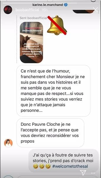 Karine Le Marchand ne se laisse donc pas faire face au rappeur français. Mais elle ne pensait surtout pas que Booba allait en rajouter une couche en publiant leur échange dans sa story Instagram avec une nouvelle réponse: « J’ai qu’ça à foutre de suivre tes stories, j’prends pas de crack moi #WelcomToTheSal ».