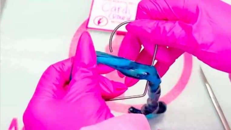 Dans la vidéo, l’artiste a préalablement préparé un fil de fer en forme de cœur, dans lequel elle va introduire le cordon ombilical. Elle coupe les extrémités qui dépassent afin d’obtenir une forme parfaite. Ensuite, elle procède au plaquage en or. Résultat : un magnifique bijou que Cardi B pourra personnaliser à sa guise !