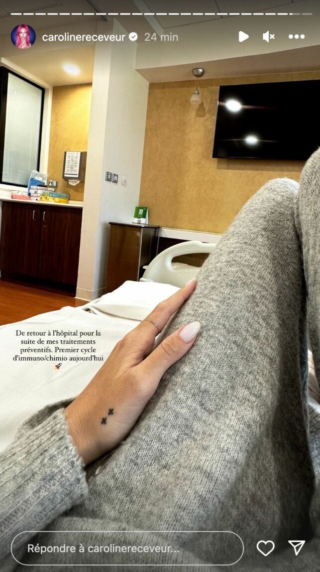 « De retour à l’hôpital pour la suite des traitements préventifs. Premier cycle d’immuno/chimio aujourd’hui« écrit-elle en légende d’une photo d’elle à l’hôpital, suivi quelques secondes après d’une photo de son cathéter près de la poitrine. Il y a fort à parier que Caroline Receveur a reçu de nombreux messages de soutien.