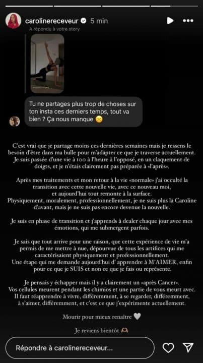 Elle poursuit en disant : « Physiquement, moralement, professionnellement, je ne suis plus la Caroline d’avant, mais je ne suis pas encore devenue la nouvelle. Je pensais y échapper, mais il y a clairement un après cancer. Vos cellules meurent pendant les chimios et une partie de vous meurt avec ».