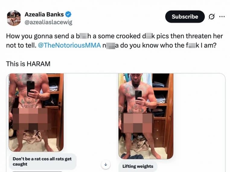Dans la même publication, Azealia montre une autre photo de Conor McGregor. Cette fois-ci, le champion de l’UFC a attaché son membre avec une haltère et a intitulé la photo « soulever des poids ». Quelle que soit la forme d’humour qu’il avait en tête, il n’a pas pu séduire la rappeuse !