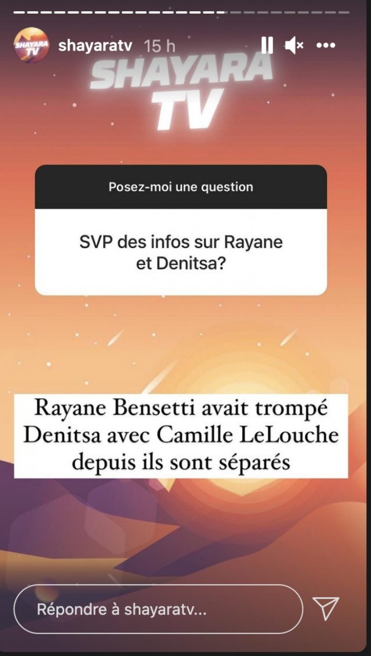 Ce mercredi 27 octobre 2021, c’est le compte Instagram Shayara TV qui remet l’histoire dans la lumière. Lors d’une session de questions/réponses, un internaute a demandé si la danseuse avait bel et bien été trompée par Rayane Bensetti, la réponse a été sans appel : « Rayane avait trompé Denitsa avec Camille Lellouche et depuis ils sont séparés » .