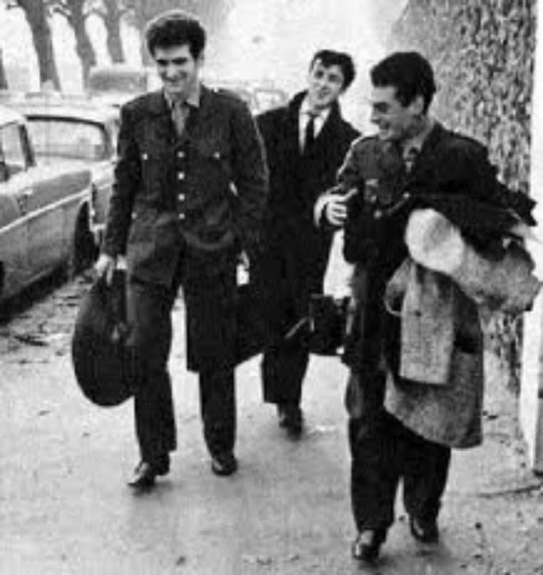 Comme le prouve la photo ci-dessus, Eddy Mitchell finit par passer de la théorie à la pratique. Avec ses amis d’enfance, Eddy Mitchell parvient à décrocher un contrat pour quelques salles comme le Golf-Drouot. Repérés, ils passent et réussissent une audition dans la foulée pour le producteur le plus côté de l’époque, Eddie Barclay. Chose étonnante, ce contrat de trois ans va être signé par les parents des concernés puisque pas encore majeurs.