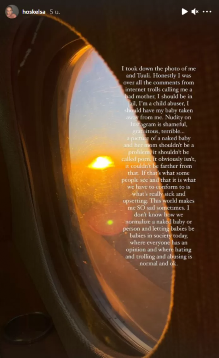 Face à l’ampleur des critiques, elle a été obligée de supprimer la photo et s’est justifiée : « Ce n’est pas de la pédopornographie » , commence-t-elle. « C’est quelque chose de normal, qui se produit tous les jours. Partout dans le monde. Et si je décide de publier ces photos, c’est mon choix. Si quelqu’un de malade sur Internet croit que c’est de la pornographie, c’est son problème, pas le mien. Je refuse de vivre ma vie en ayant peur de ce que cette personne pourrait faire sur Internet » .
