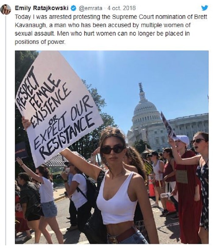 « Aujourd’hui, j’ai été arrêté pour protester contre la candidature de Brett Kavanaugh à la Cour suprême, un homme qui a été accusé d’agression sexuelle par plusieurs femmes. Les hommes qui font du mal aux femmes ne peuvent plus être placés dans des postes de pouvoir, » écrit Emily Ratajkowski sur les réseaux sociaux. Une initiative courageuse mais très critiquée par de nombreux internautes qui ne comprennent pas sa tenue jugée trop sexy.