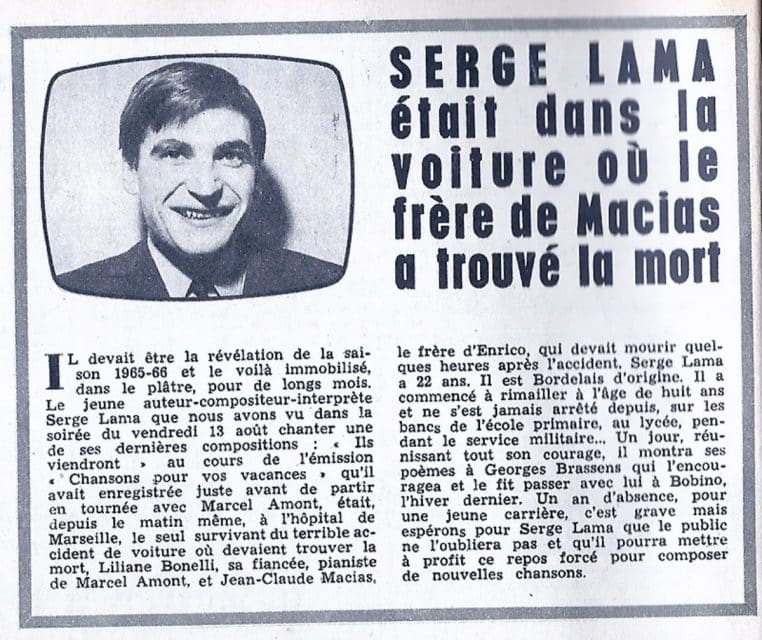 Le 12 août 1965, l’équilibre d’Enrico Macias va vaciller. En effet, en apprenant l’accident dramatique de son frère, il s’effondre. Pire encore, le défunt était en compagnie de son collègue Serge Lama ainsi que de sa fiancée. Sans qu’on se l’explique, la voiture conduite par Jean-Claude a dérapé et a fait plusieurs tonneaux. Résultat des courses, seul l’interprète de « Je suis malade » s’en sort…mais avec de multiples séquelles ! Opérations, convalescence, rééducation, le chemin est long et sinué d’embûches pour le survivant du drame.