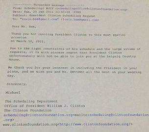 Cher Monsieur Bam, merci d’avoir invité le Président Clinton à la plus spéciale des occasions le 12 mars 2011. En raison des contraintes serrées de son emploi du temps, c’est avec un profond regret que malheureusement le President Clinton ne pourra pas se joindre à vous au Leipzig Country House. Nous vous remercions de votre intérêt à inclure le président dans vos projets et nous vous souhaitons ainsi qu’à Madame Dettmer tout le meilleur pour votre mariage. Sincèrement, Michael.