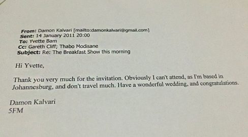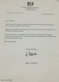 Cher Monsieur Bam. Merci d’avoir écrit au Premier ministre à propos du mariage à venir de Monsieur Louis Bam et Madame Yvette Dettmer. J’espère que vous comprendrez que les nombreux appels sur son temps rendent impossible au Premier ministre d’y assister. Cependant, nous vous sommes très reconnaissants de nous avoir informés de cette occasion spéciale et j’espère que vous et Estelle vivrez un jour merveilleux le 12 mars et aurez un mariage long et heureux. Meilleurs vœux Sincèrement vôtre.