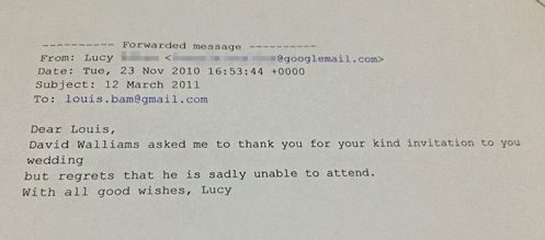 Cher Louis. David m’a demandé de vous remercier pour votre aimable invitation à votre mariage mais regrette que malheureusement il ne puisse pas y assister. Meilleurs vœux, Lucy.