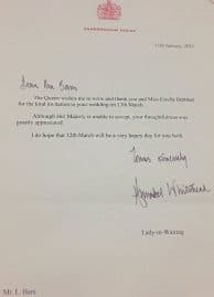 La Reine m’a sollicité pour vous écrire et vous remerciez vous et Madame Estelle Dettmer pour l’aimable invitation à votre mariage le 12 mars. Cependant, la Reine ne peut pas accepter, votre prévenance est très appréciée. J’espère que le 12 mars sera un très bon jour pour vous deux. Sincèrement vôtre.