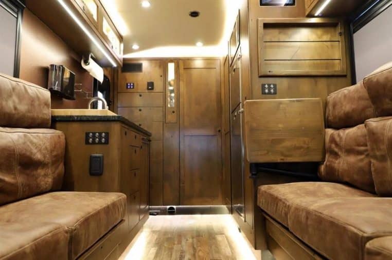 Et dans sa maison sur roues, l’acteur bénéficie d’un lit king size, d’un porte-vélo, ainsi que d’une caméra infrarouge. Près de la cuisine, il a décidé d’installer deux canapés en cuir marron et deux tables en bois.