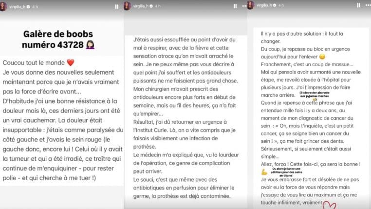 Mais après l’opération, la journaliste connaît quelques complications qui l’obligent à retourner à l’hôpital. En effet, Virgilia Hess souffre de grosses douleurs, et les médicaments n’arrangent pas la situation. « J’ai dû retourner en urgence à l’Institut Curie. Là, on a vite compris que je faisais visiblement une infection de prothèse » indique-t-elle en storie.