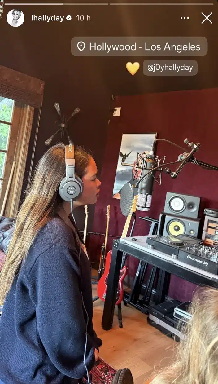 Ce jeudi 9 avril 2026, Laeticia Hallyday a publié deux stories sur son compte Instagram. On y découvre sa fille cadette dans un studio d’enregistrement situé en plein cœur d’Hollywood, à Los Angeles. Sur les clichés, Joy porte un casque audio et se tient face à un micro professionnel. L’ambiance est clairement celle d’une session de travail, pas d’une simple visite touristique.