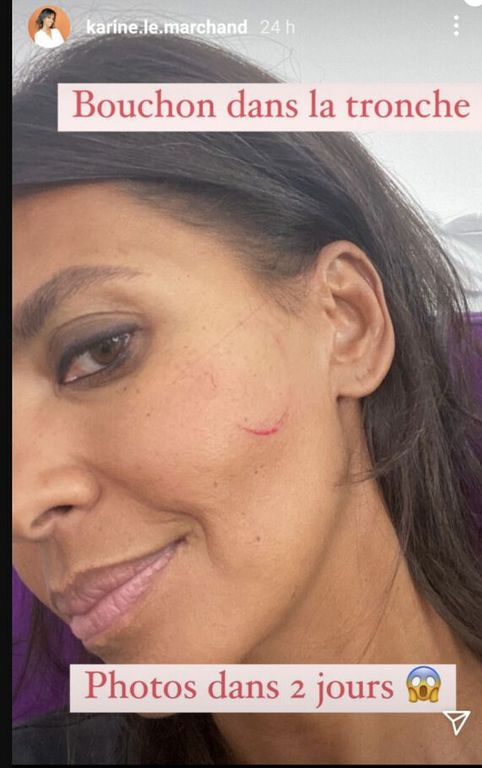 Mais si aujourd’hui elle fait parler d’elle, c’est pour une raison étonnante. Ce dimanche 20 juin, Karine Le Marchand passait un bon moment avec ses proches. Pour fêter cela, elle a décidé d’ouvrir une bouteille de champagne. Mais tout a basculé. Et pour cause, elle a reçu le bouchon en plein visage ! Elle a posté une photo sur son compte Instagram pour dévoiler son impressionnante blessure !