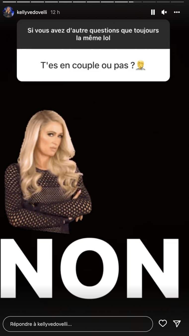 Kelly Vedovelli a ensuite répondu à une question d’ordre plus personnelle. Un fan lui a demandé si elle était en couple, ce à quoi elle a répondu par un « non » en majuscules, accompagné d’un gif de Paris Hilton, les bras croisés et visiblement agacée. Voilà une réponse claire concernant les rumeurs de couple avec Cyril Hanouna !