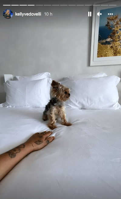 Sur le cliché posté par Kelly Vedovelli, on peut donc voir son adorable chien qui pose fièrement sur un lit. La main de la chroniqueuse n’est d’ailleurs pas loin, prête à bondir pour quelques caresses !